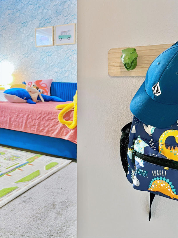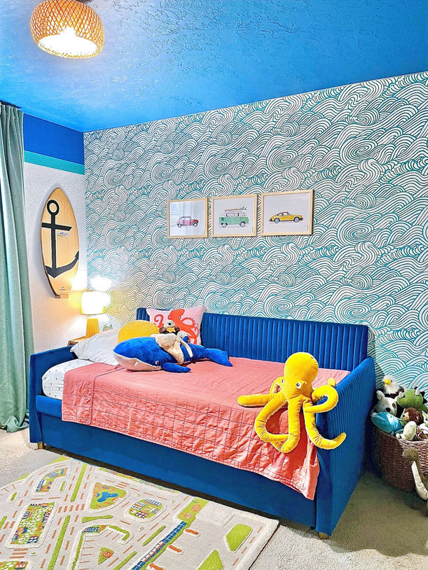 Designed with the philosophy of Play-Based Learning, this children's room is a realm where play and education converge seamlessly. It's a space that nurtures both body and mind through diverse play activities—featuring everything from a climbing wall to skill-building play zones. Influenced by a young boy's love of the ocean and cars, the room boasts a striking Japanese inspired wave wallpaper and a custom rainbow mural, balanced by a deep blue ceiling that inspires wonder and a sense of calm. Natural elements add the final touch, ensuring a snug and inviting atmosphere.